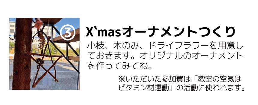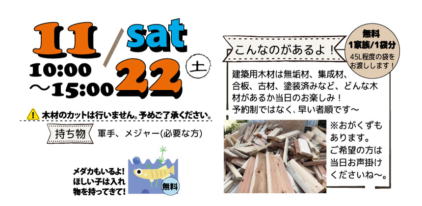 11/22 SDGsイベント 「LET ’s REDUCE WOOD LOSS!」=ウッドロスを減らそう!vol.4 開催日 2025.11.22(土) 時間 11:00~15:00 場所 エコショップ+(プラス)庭回り 備考 持ち物:軍手、メジャー(必要な方)※小雨決行:荒天候は中止 建築廃材を再利用していただくイベントです ※ 雨天中止となります。 その際はブログまたはインスタグラムをご覧ください エコショップblogはこちらから エコショップ+のインスタグラムはこちらから